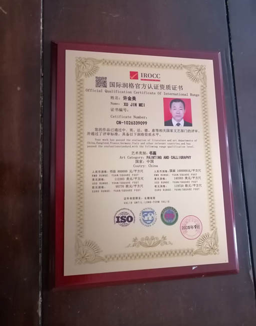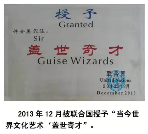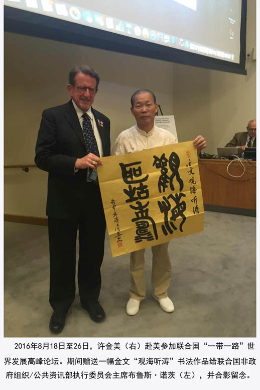 2025年12月19日,我写的金文《毛泽东词沁园春雪》参加联合国举办的“地球生灵之美艺术展”荣获金奖。充分证明了他的书画艺术实力和影响力。许金美多才多艺,诗文书画全能,尤其是甲骨文书法独树一帜。他撰写的《怎样写甲骨文》和《甲骨文毛泽东诗词全集》,由中国美术出版社出版。2017年7月入编世界非物质文化遗产名录。他创作的《甲骨文三字经、千字文、弟子规、增广贤文》長卷近120米,以及正在创作的《老子德道经》長卷近80米,都是甲骨文书法领域的鸿篇巨制,令人震撼。这些作品为中国甲骨文书法的研究和传承作出了重要贡献。许金美创作的书画作品均为孤品,深受国内外单位、企业家和收藏家的喜爱。他的作品被联合国教科文组织、安阳殷墟博物馆、江西舒同博物馆、日本东京画院等31多个单位和企业家收藏。2024年8月,他创作的《中华甲骨文百家姓》300亇姓氏,由国宝档案展示。这充分展示了他在甲骨文领域的卓越成就。只有辛勤不断耕耘,才能结出丰硕之果。近年来,许金美在书画创作上由于成绩显著。2016年6月,中访网全媒体中心以“中国正能量艺术家一一许金美”;2020年11月,中国艺术研究会、中国名家画院以“国家巨星一一许金美”;2022年6月,中央电视台朝闻天下为献礼香港回归25周年,以“一代翘楚一一世界艺坛领军人物许金美'';央视书画频道以“新时代艺术领袖许金美";焦点访谈人物以“世界文化艺术一代宗师许金美”;中国新闻联播以"国家艺术形象人物许金美”和中国主题巡展组委会以《中国文化人物》作为全国艺术家的代表等十二个频道分别作了专题报道,在国内外文艺界产生了巨大影响,为中外的文化艺术交流做出了巨大贡献。