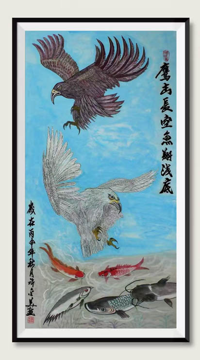 国画:鹰击长空,鱼翔浅底。138x69㎝