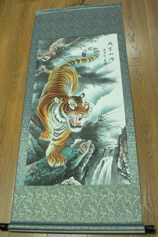 《威震山河》国画真迹山虎之地,是勇敢,力量与强大的象征,本幅作品为“下山虎”,画面整体布局远近有秩,瀑布缓流山之涧。风水讲究山管人丁,水管财,代表着山水相汇,象征着人财皆有,大吉大利,水为财,细水长流,代表着财源滚滚。 画面右上角,为松树,松树象征着健康,长寿,它四季常青,被人们誉为万年松,同时松树又被称为“拔地苍龙”,苍龙为万物的守护者,有着佑家佑业佑财富的寓意。 画面正中间,一只下山虎,虎长期以来一直被当作是权利和力量的象征,为人们所敬畏。国人深爱老虎的勇猛和力量,尊称其百兽之王。因此,虎在中华民族文化之中是英雄、权利、辟邪、吉祥的象征。中国人自古就喜欢虎,虎是强壮、威武的象征,是代表吉祥与平安的瑞兽;同时,虎又是兽中之王,还代表着威严、权利和荣耀。 上山虎一般采用傲视群雄和抬头望月的姿势,饰以松枝明月,显得宁静深远。因此,在客厅内,办公室内悬挂老虎画,画中老虎为下山虎样式,因为老虎下山则遨游三山五岳,寓意平安无事,步步登高。本幅画中的虎,威武雄健,皮毛金灿,表情从容,于山之顶傲视万物,可以看出,此虎为丰衣足食的虎之王,健硕霸气,象征着生活丰衣足食,丝丝金毛代表事业事事如金,好运相伴,从容的表情不凶狠,代表自信,与强大的勇气。